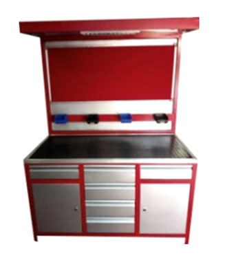S.S top covered with Hi grade PVC sheet. Tool board for hanging tools with plug & play tools. Drawers & cabinet for keeping dismantled Parts.