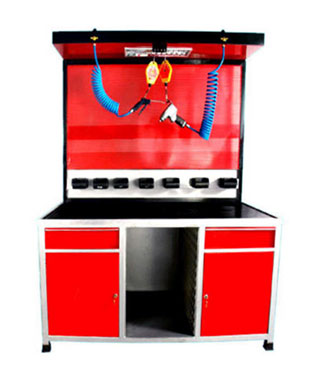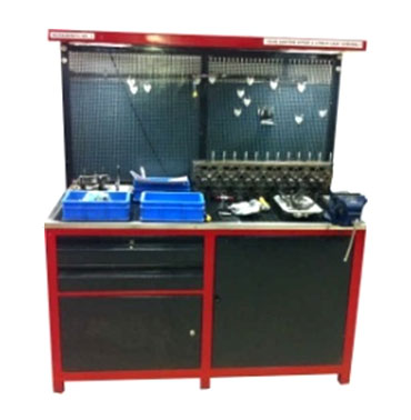 M.S top covered with Hi grade PVC sheet. Tool board for hanging tools with plug & play tools. Drawers & cabinet for keeping dismantled Parts. Bins are provided for keeping small Parts.